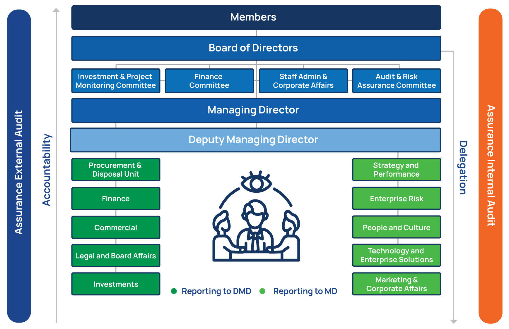 We have robust processes in place to ensure that the delegation flows through the Board and its Committees to the MD and EXCO into the organisation. At the same time, accountability flows upwards from the Fund to its members. This process helps to ensure alignment and open communication with our members and all our stakeholders.