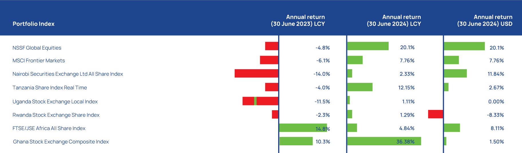 Source: Bloomberg It is important to note that, while the strong gross positive returns are encouraging in this period of uncertainty, our focus remains on the long-term sustainability of the Fund`s investment programme. Capital markets are naturally subject to volatility in the short-term, which is why we prioritise long-term performance. The Fund invests for decades to match its liability profile, not just for a single year. To this end, one-year returns of 17.10% are just part of the results picture for a retirement savings scheme like NSSF. Even returns over 3 years (13.50%), 5 years (14.04%) and 7 years (14.60%)— annualised returns, as shown in Table 1 below, represent relatively short to intermediate time frames for measuring results.