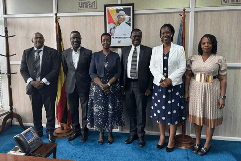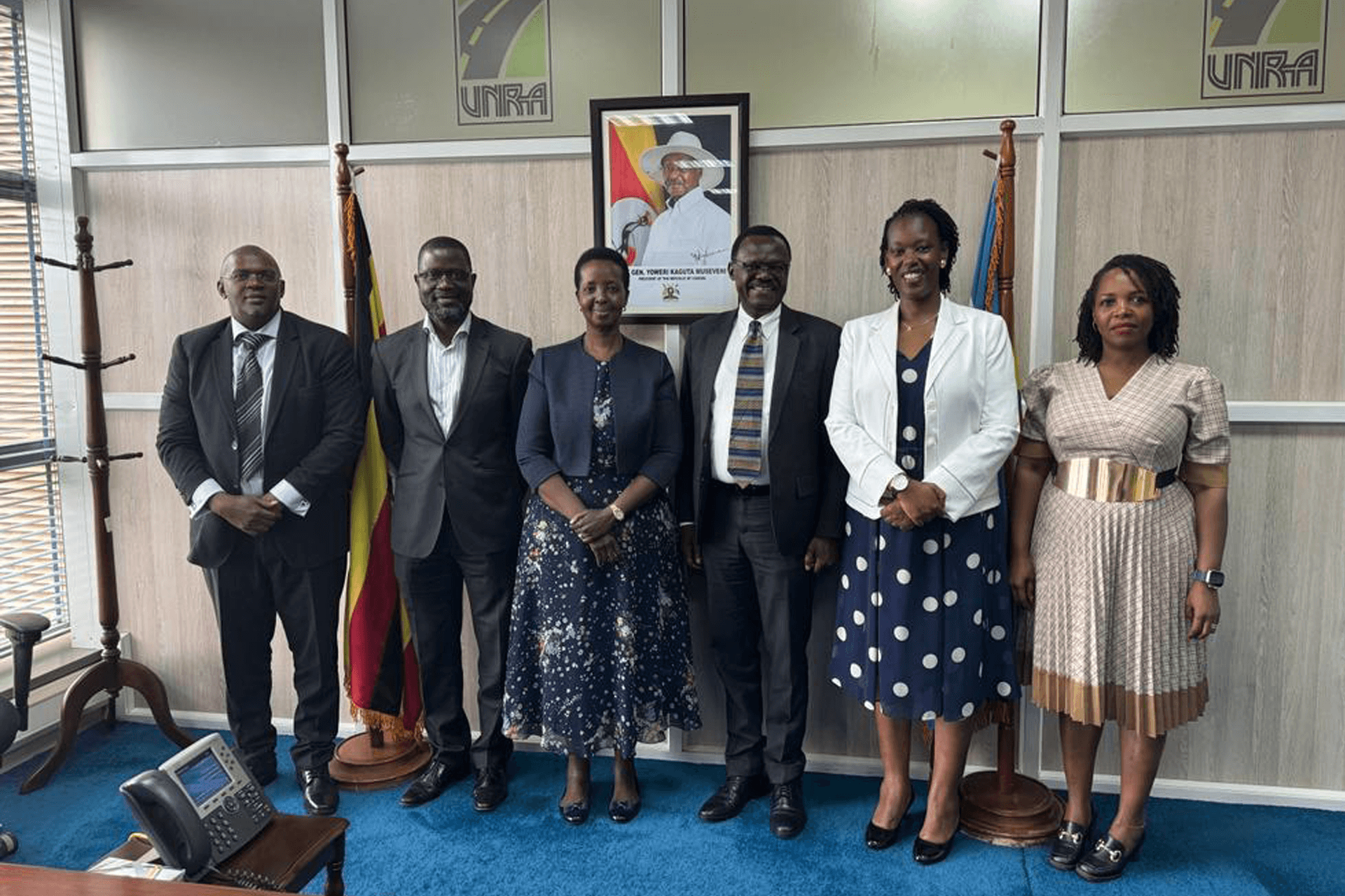 Image 1: From Right, NSSF team: Rebecca Kabugo, Peninah Kabagambe and Patrick Ayota, Managing Director, NSSF, after a Partnership engagement framework with Allen Kagina, UNRA Executive Director third from left.