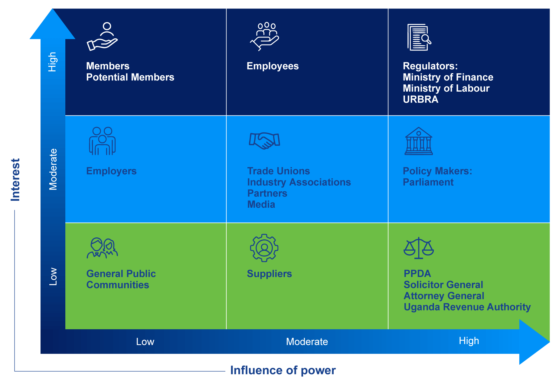 Our stakeholders include oversight bodies, government entities, trade unions, media, professional associations, service providers, members, and our management and employees.